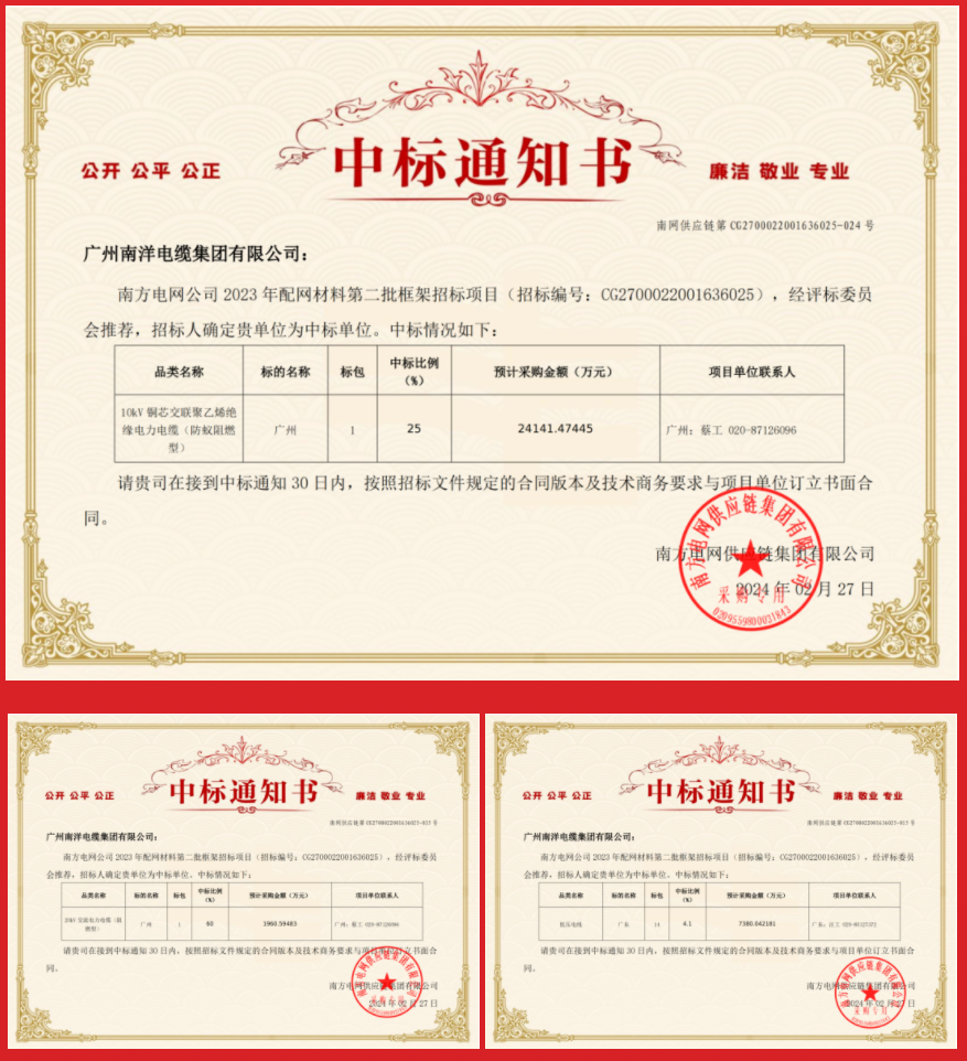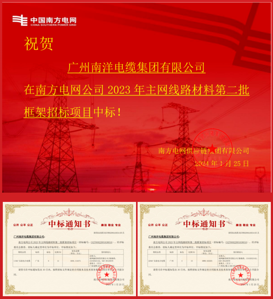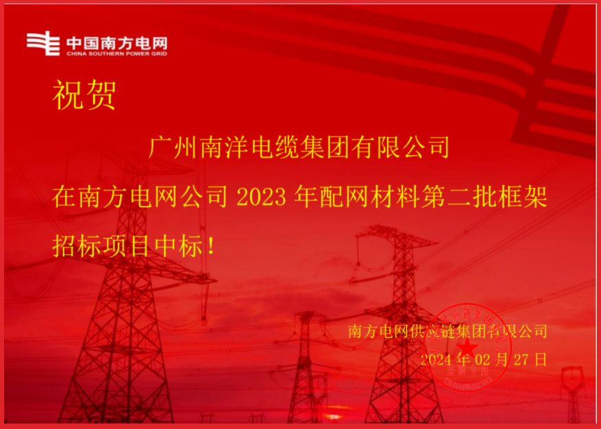 新年伊始,公司喜迎“開門紅”!近期,南方電網公司相繼發布了2023年主網線路、配網材料第二批框架招標項目中標通知書,祝賀廣州南洋電纜集團有限公司繼續成為南方電網公司主、配網材料框招項目雙中標供應商!中標金額4.3億元!