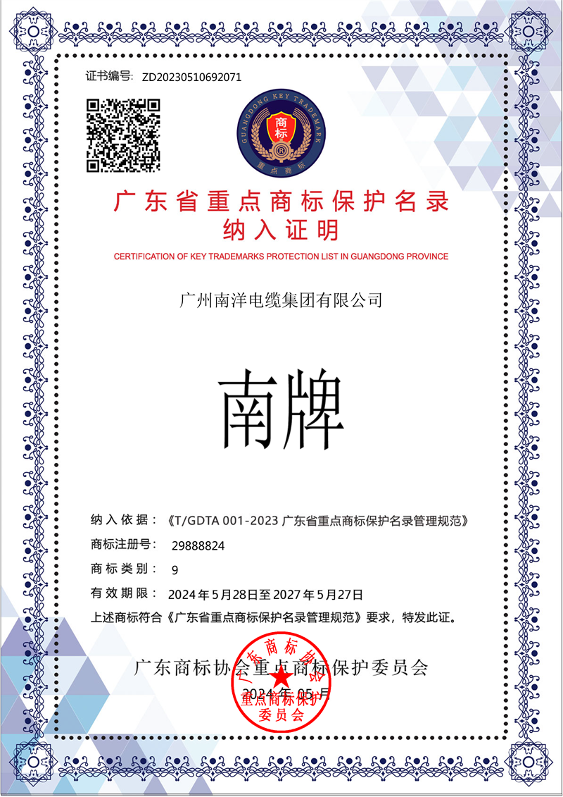 NAN南牌電纜創(chuàng)于1985年, 至今近40年歷史,是國家工商總局認(rèn)定的中國馳名商標(biāo),國家質(zhì)檢總局評定的中國名牌產(chǎn)品。我司在2020年首次被納入廣東省重點商標(biāo)保護(hù)名錄,今年是第二次成功入選廣東省重點商標(biāo)保護(hù)名錄。連續(xù)入選,是對我司品牌價值和商標(biāo)管理的認(rèn)可,也是我司在品牌建設(shè)和知識產(chǎn)權(quán)保護(hù)方面的重要里程碑。
