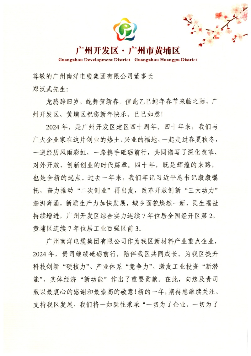 1月25日,值此乙巳蛇年春節(jié)來臨之際,廣州開發(fā)區(qū)、黃埔區(qū)領(lǐng)導(dǎo)向我司發(fā)來節(jié)日慰問信,向鄭漢武董事長及我司致以節(jié)日的祝福!